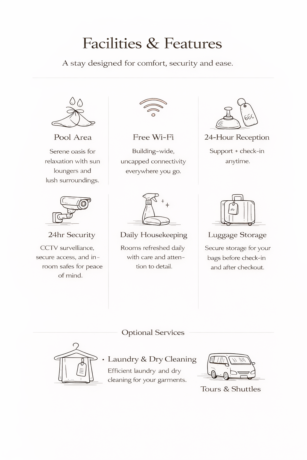 Explore what the building offers, from co-working corners to fast Wi-Fi, smart security, on-site staff, and quiet places to unwind.